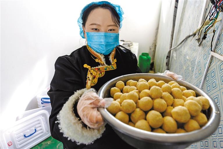 11月28日,在基地就業(yè)的牧民白瑪卓嘎展示剛剛做好的奶制品。新華社記者 姜帆 攝